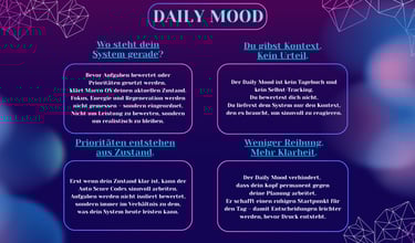 Es verbindet Produktivität, Entscheidungslogik und Selbstorganisation in einem System, das nicht auf reine Aufgabenverwaltung, sondern auf Kontext, Zustand und langfristige Stabilität ausgerichtet ist.